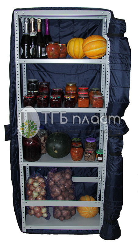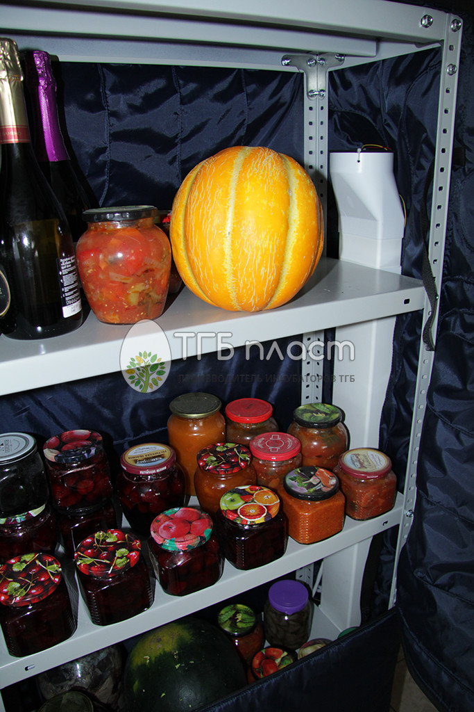 «Балконный погребок-стеллаж ТГБ-300» представляет собой сборно-разборную конструкцию в виде стеллажной системы с 4-мя полками, утепленной трехслойным материалом. Подходит для хранения овощей, фруктов, консервации, напитков в неотапливаемых помещениях при температуре окружающей среды -40…+5 °C. При этом внутри термошкафа поддерживается постоянная температура 0…+7 °C.